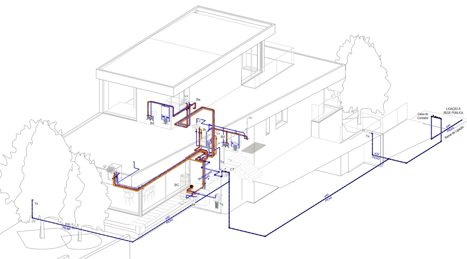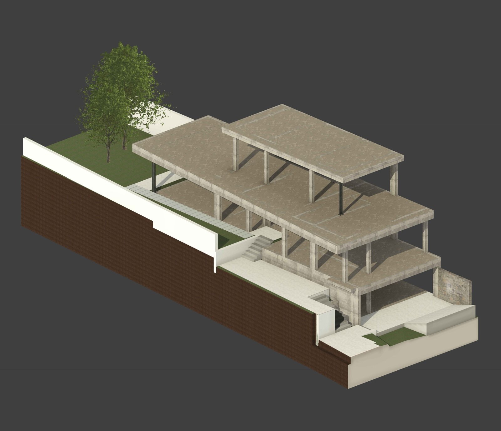 Construção de Moradia Unifamiliar e muros. Foi realizado pela Engiplan o desenvolvimento dos projetos de especialidades de Estabilidade e das redes de abastecimento de água, de drenagem de águas residuais e de drenagem de águas pluviais e modelagem da Arquitetura em 3D.